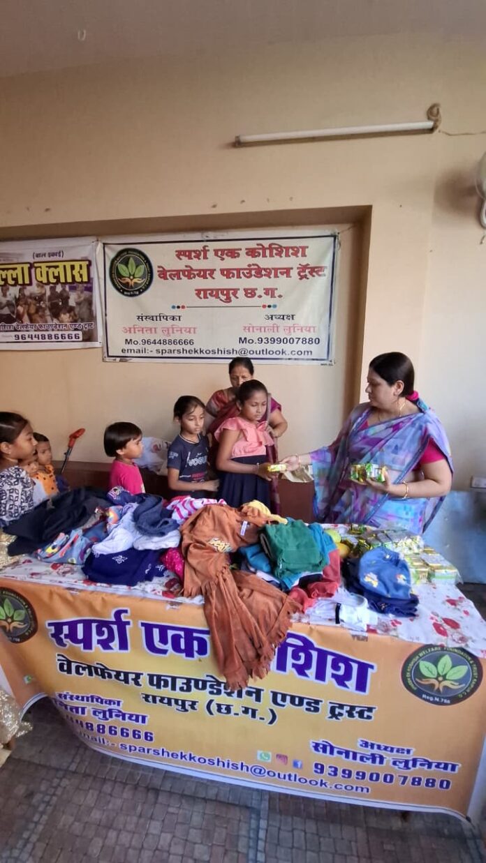 रायपुर – समाज सेवा के क्षेत्र में निरंतर कार्यरत स्पर्श एक कोशिश वेलफेयर फाउंडेशन एंड ट्रस्ट, रायपुर ने आज एक सराहनीय पहल करते हुए ज़रूरतमंद बच्चों के बीच आम, बिस्किट और कपड़ों का वितरण किया।