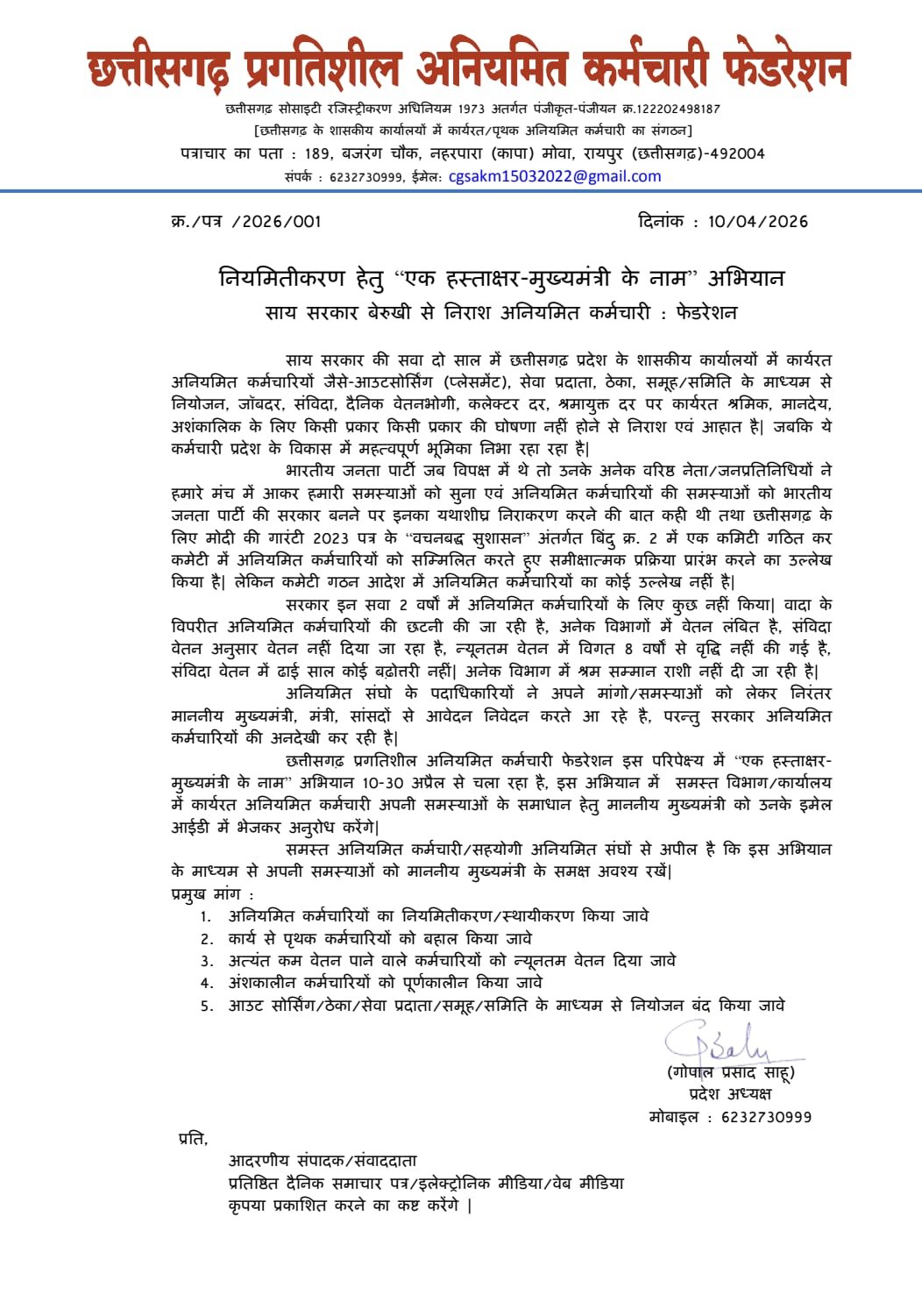 नियमितीकरण की मांग को लेकर अनियमित कर्मचारियों का हस्ताक्षर अभियान तेज : प्रेमप्रकाश गजेन्द्र