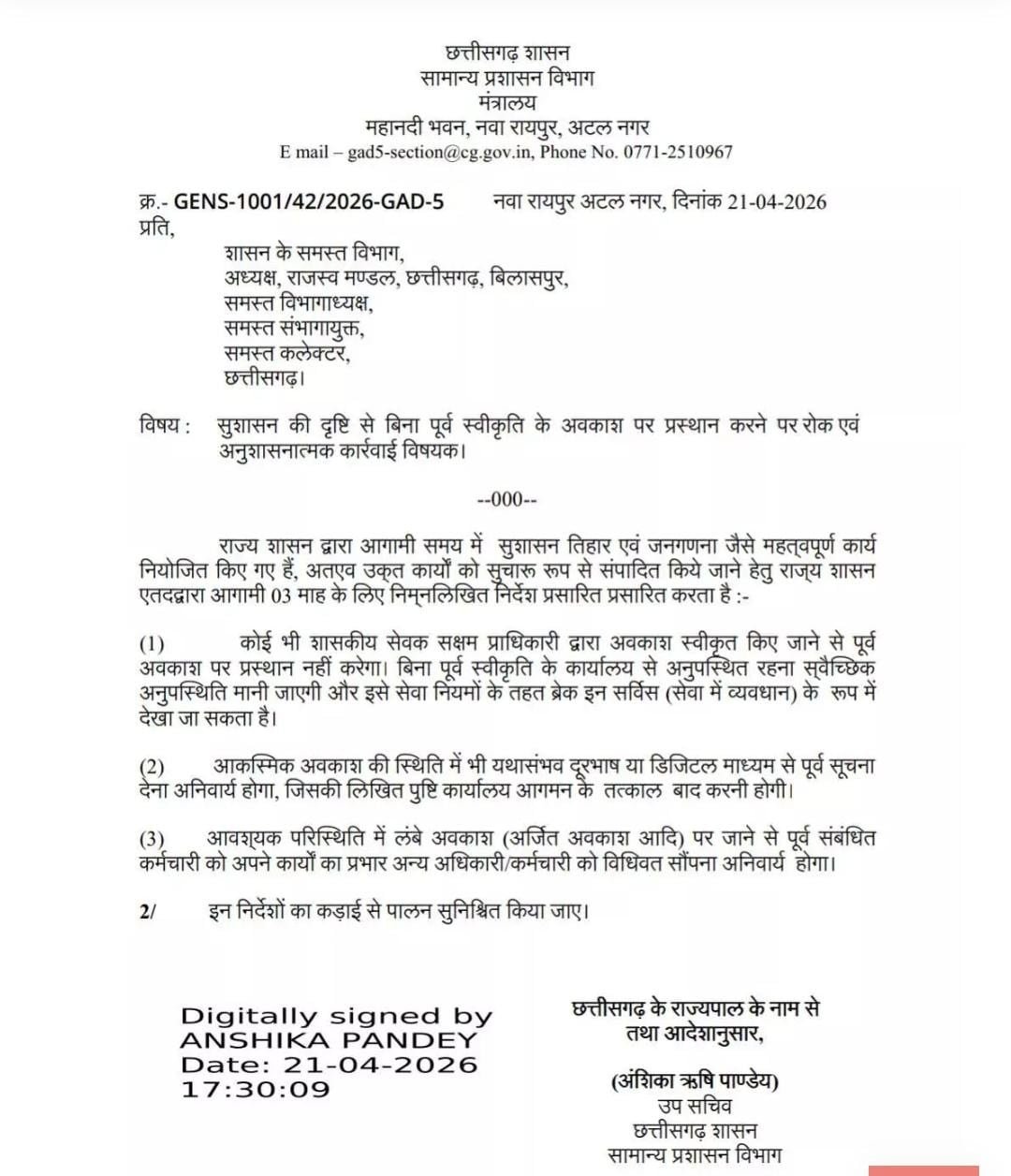 दरअसल, आगामी जनगणना कार्य और “सुशासन तिहार” के सुचारू संचालन को ध्यान में रखते हुए यह निर्णय लिया गया है। आदेश के मुताबिक, अब कोई भी कर्मचारी बिना पूर्व अनुमति के अवकाश पर नहीं जा सकेगा। शासन ने स्पष्ट किया है कि बिना स्वीकृति छुट्टी पर जाना गंभीर अनुशासनहीनता माना जाएगा।
